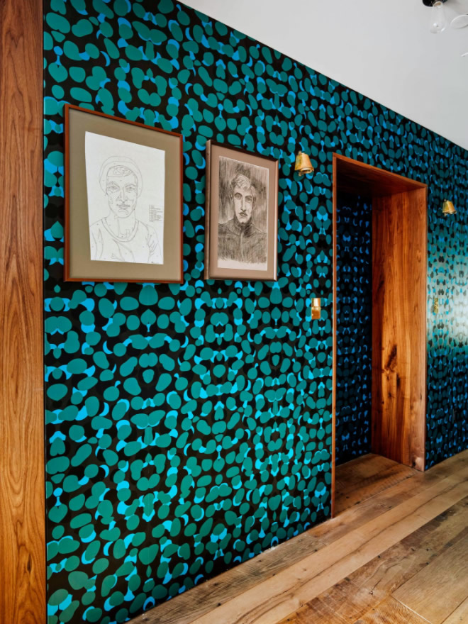 En el pasillo, un papel tapiz diseñado por Lenny Kravitz. Definitivamente no es un diseño que yo escogería para mis espacios (creo que me cansaría después de un tiempo), PERO me gusta el estilo retro moderno que tiene.