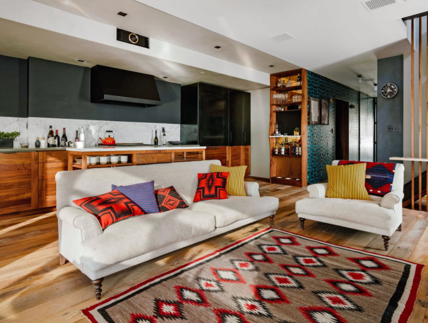 The dining room is simple, and yet, soooo bold! There are no chairs, only stools, a wood and iron table, and an industrial pendant… I love the hard rock vibe this space has.