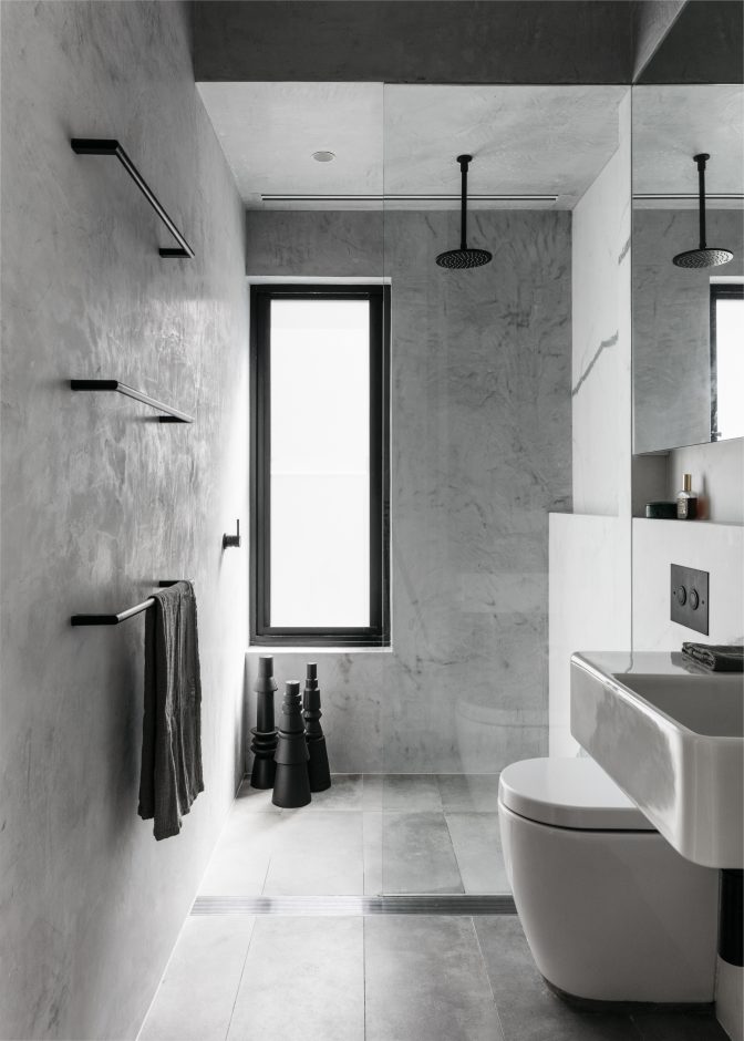 Acá otro baño, ahora gris y blanco con grifería y accesorios en negro. Si se fijan, las dimensiones de este baño son de hecho muy chiquitas, sin embargo no se ve apretado por la elección de acabados y el cristal, que divide la regadera pero la vista lo pasa por alto.