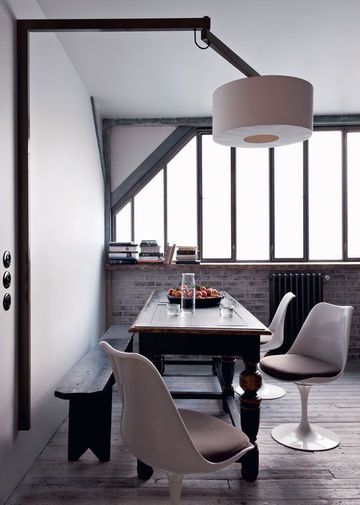 Located in what used to be an old factory, this loft was beautifully renovated and decorated with vintage and designer pieces (I love the Tulip set in the dining room and office). A perfect little cozy home based on grays and splashes of color here and there. 😉