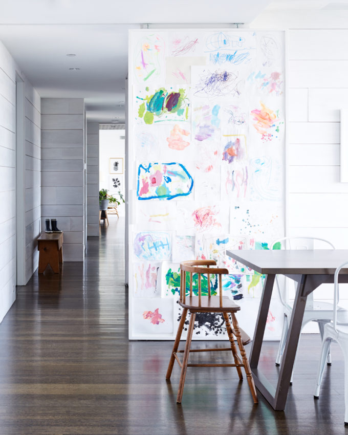 Una puerta deslizable, llena de dibujos de los niños… ¡qué maravilla, verdad? Es una preciosa manera de inyectar color, pero sobretodo de integrarlos!!!!