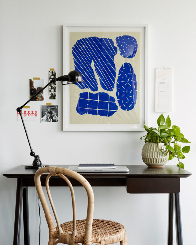 El pequeño rincón de oficina en casa, con un cuadro, fotos, la lámpara y la planta teléfono.