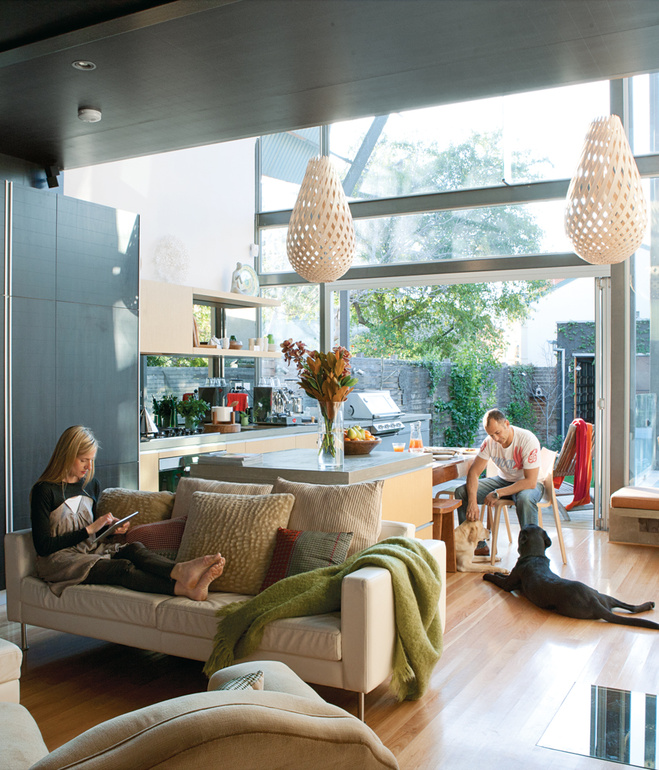 Me encanta lo que el arquitecto Phil Harris hizo con el espacio, haciendo que sala, cocina y comedor convivan juntos (algo cada vez más frecuente), de forma que a pesar de ser una casa pequeña, se siente amplia, y es perfecta para invitar amigos y disfrutarse. Mi elemento favorito son las lámparas, diseño de David Trubridge, que estelarizan el espacio y brindan calidez (especialmente de noche).
