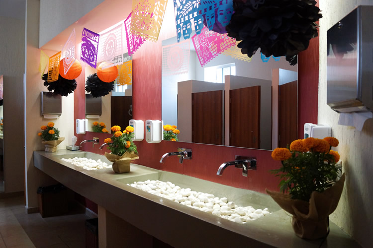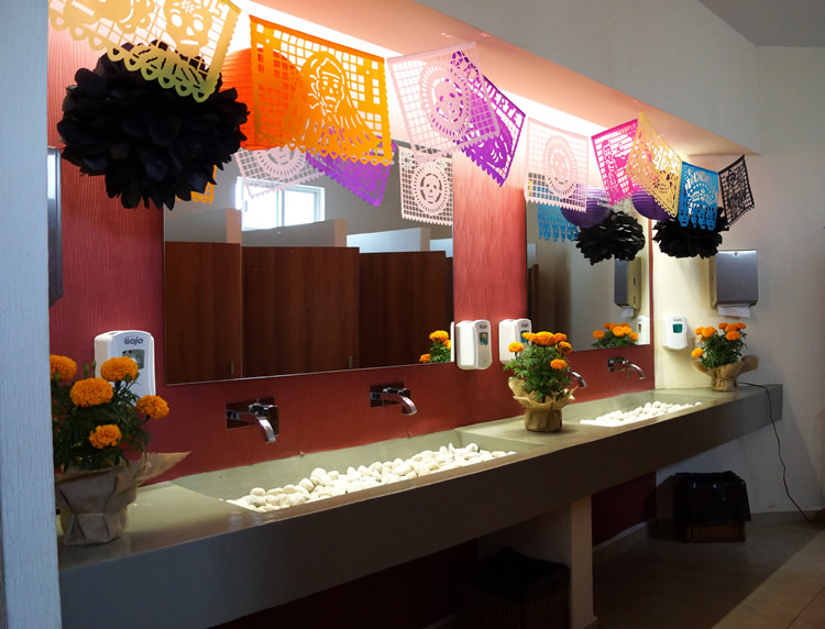 El baño de damas también lo hicimos especial. Empezando por la puerta, que decoré con una hermosa calavera, creación de mi talentosísima hija. Y por supuesto, otra flor 😉