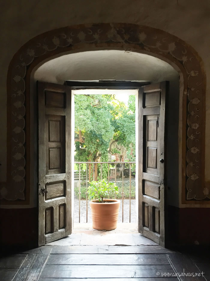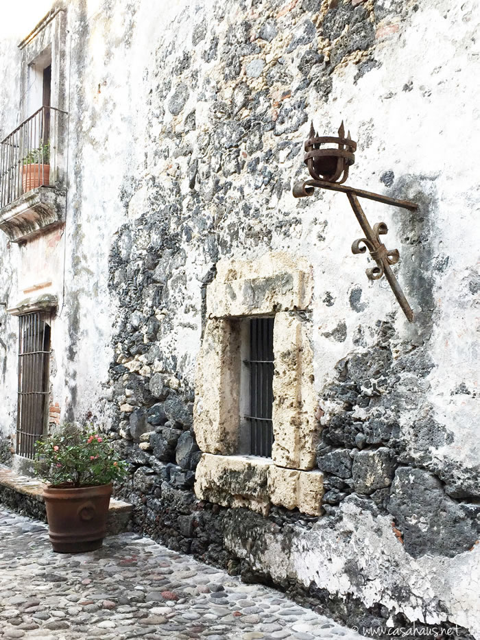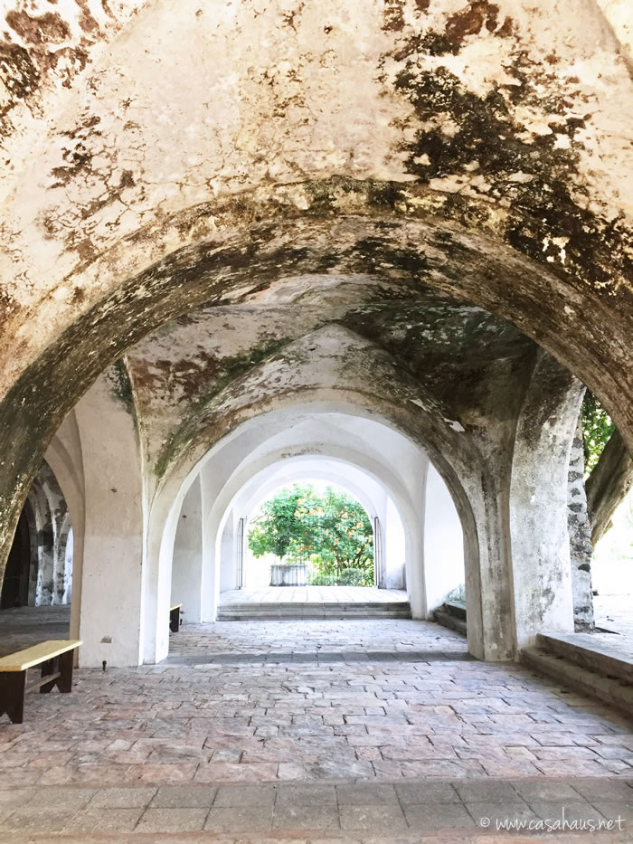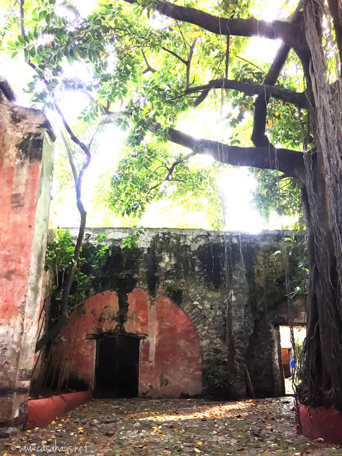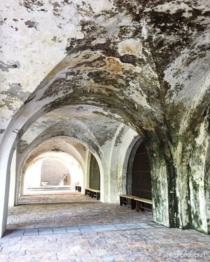 El tunel que comunica la capilla con el jardín trasero y la terraza donde se realizan los eventos. ¡Amo las manchas y la pintura corroída! A la derecha, tras las rejas, las bodegas de lo que antes fuera esta hacienda azucarera.